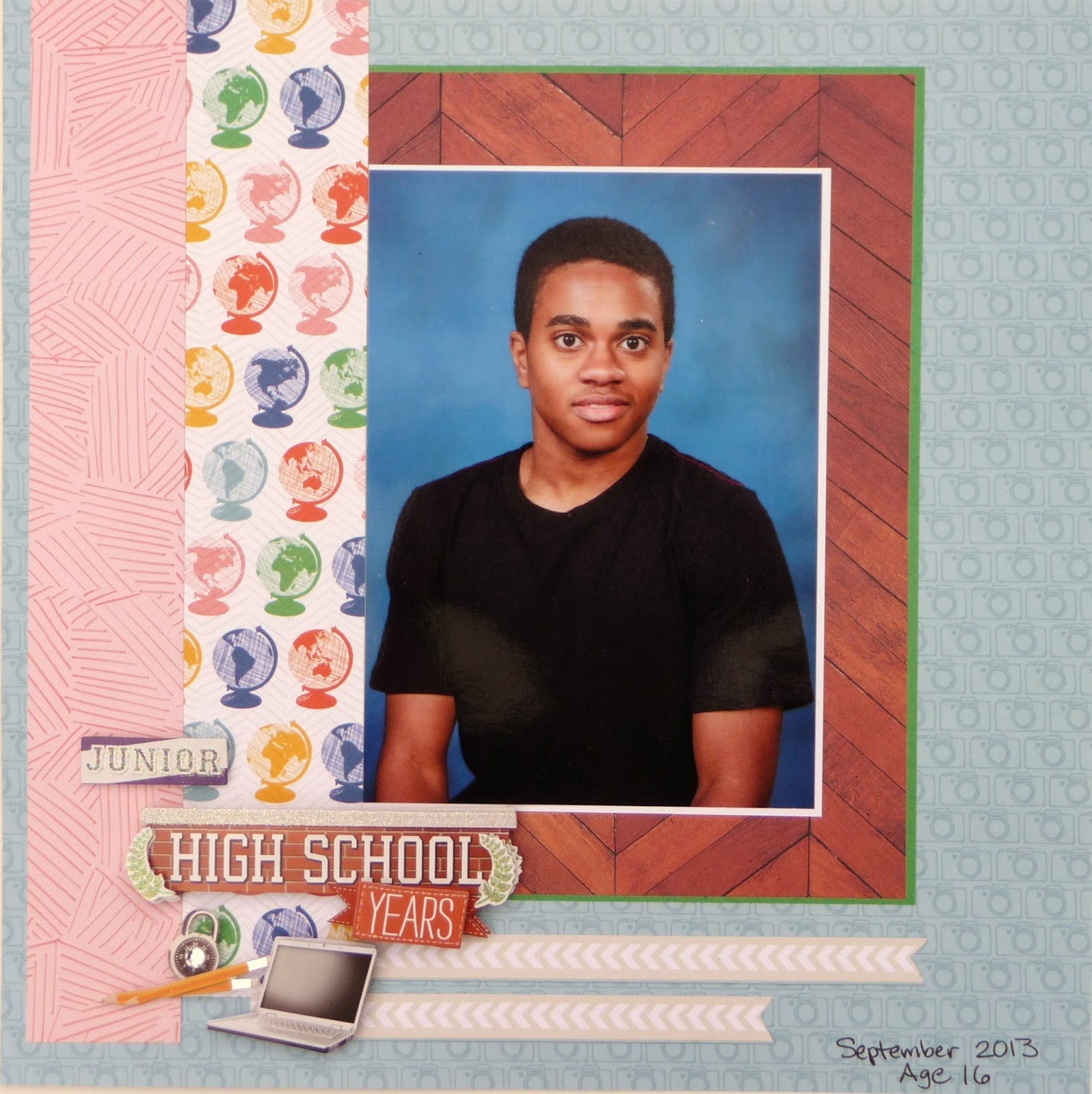 Junius Hill, proud dog owner and a friend of my grandparents, graces my scrapbook page today. The patterned papers are all by Graphic 45. The little dog diecut is stamped from the MFP Kilt Fun stamp set.